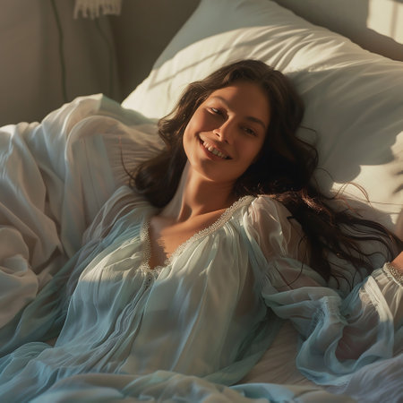 Beautiful young woman lying in bed and smiling at camera at home