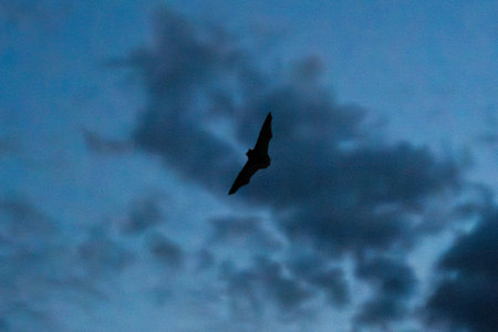 A solitary bat gracefully glides through a beautifully textured blue night sky that is filled with countless stars
