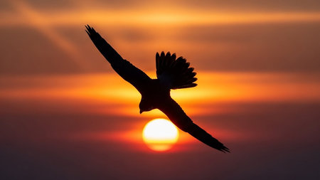 Bird in flight against vibrant sunset, showcasing its wings spread wide. warm colors of sky create serene and peaceful atmosphere, highlighting beauty of nature