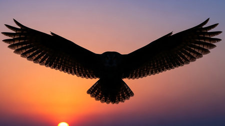 An owl silhouette with wide wings spread flies against a colorful sunset sky. Clear details and vibrant colors...