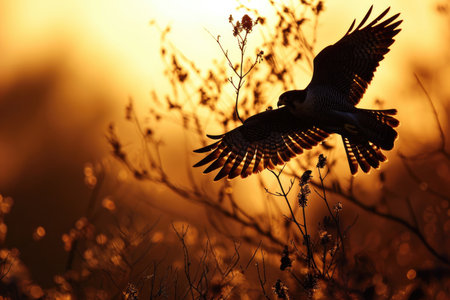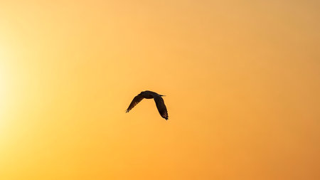 A stunning silhouette of a bird in flight caught against a golden sunset, showcasing the beauty of nature and the tranquility of the evening atmosphere.