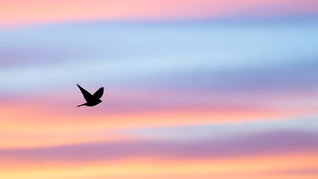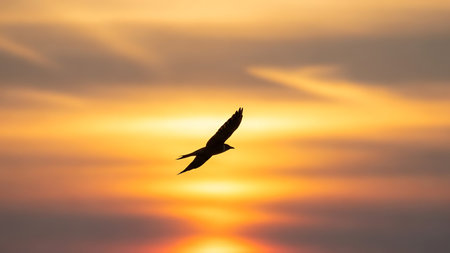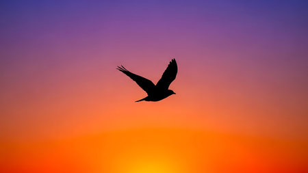 Bird silhouette flying at sunset with colorful sky and clouds creating peaceful and inspiring scene