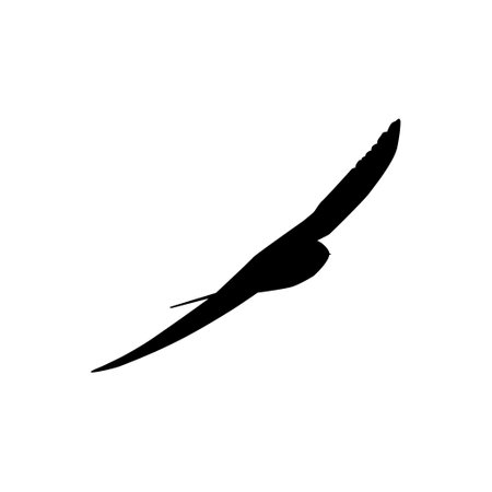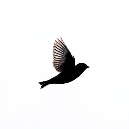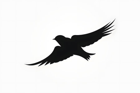 A striking black silhouette of a bird in mid-flight against a pristine white background. The image evokes feelings of freedom and effortless movement.