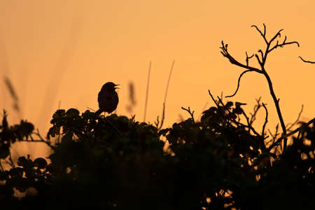 Meadow Pipit (Anthus pratensis) perched on a bush in the late evening with the sun setting in the back.