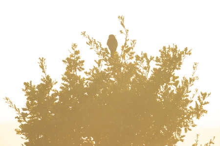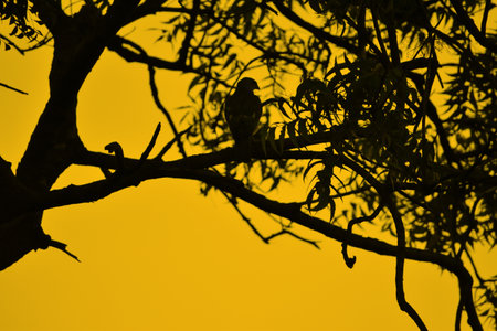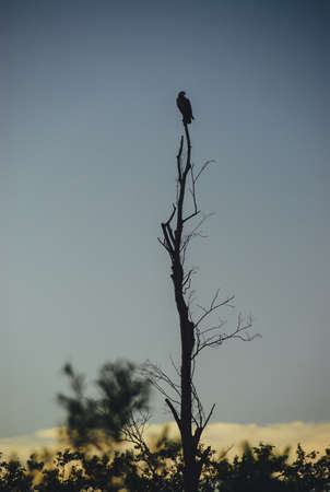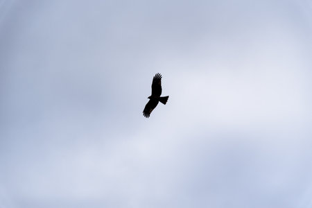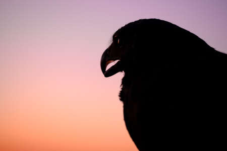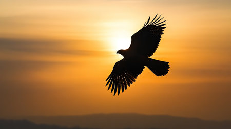 Silhouette of a bird of prey soaring in the sky at dawn, with ample space for copy in the sky.