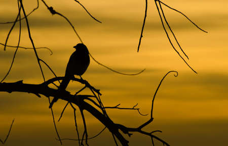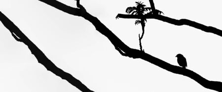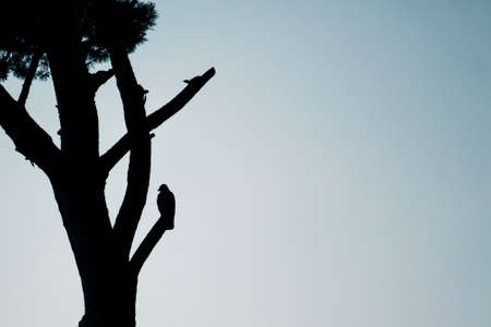 Silhouette of a bird on the branches of a tree on a blue sky background. Space for copying text