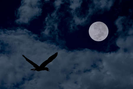 Eurasian eagle-owl (Bubo bubo) flying silhouette at night in spring.