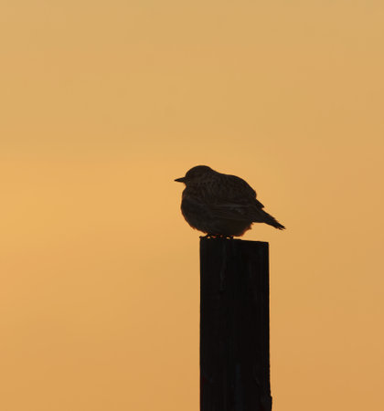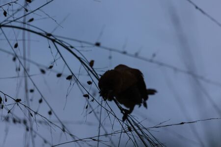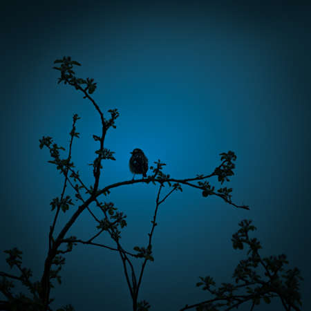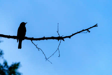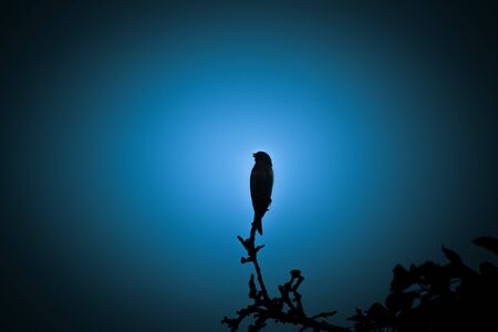 A beautiful dark silhouette of a small singing bird against the blue sky in the evening. Clean, monochromatic look.