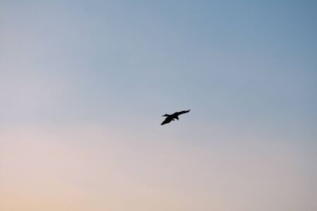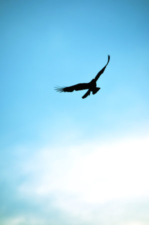 A beautiful silhouette of a flying crow against the blue sky. Flying bird in cloudy day.