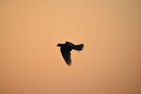 Silhouette of a flying pigeon on sunset sky background. Bird in flight.