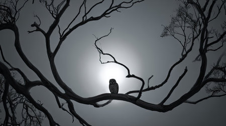 An owl perches on a tree branch, silhouetted against a clouded sky. The image presents a monochromatic palette, with the tree branches forming an intricate pattern. The overall style suggests a dramatic mood, perfect for various illustrative and commercial applications. The lighting highlights the subject against the background.