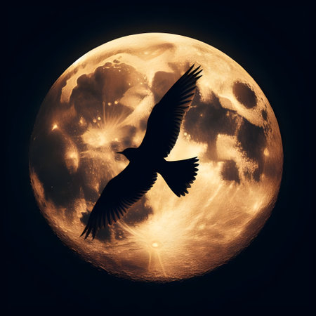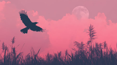 A captivating silhouette of a bird in flight against a serene pink sky featuring a full moon. Ideal for evoking peace and tranquility in nature imagery.