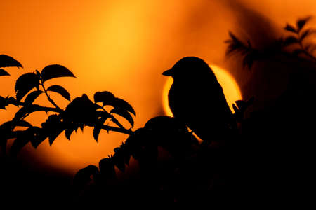 Red-backed shrike (Lanius collurio) male, beautiful songbird sitting on a branch at sunset. Shrike silhouette with orange background. Wildlife scene from nature. Czech Republic