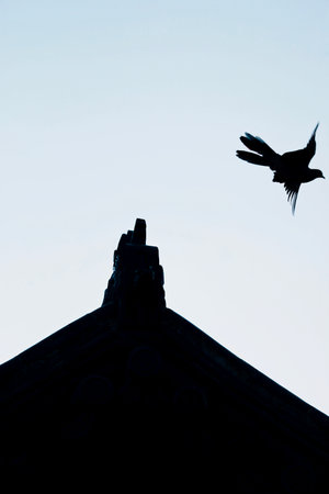 Silhouette of a red kite (Milvus milvus) in flight at sunset, UK.
