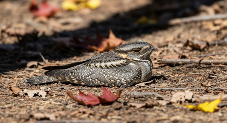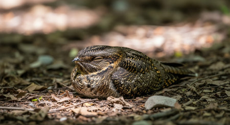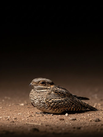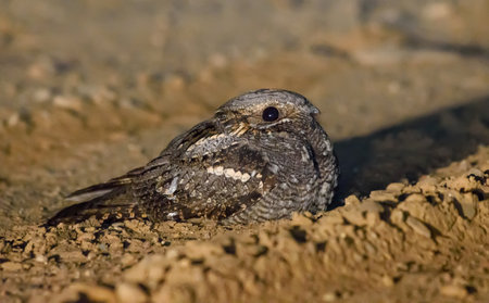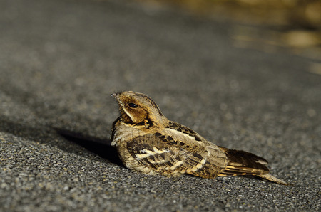 Risky European nightjar (Caprimulgus europaeus) sits and rests on sandy road at spring night