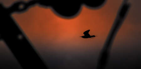Silhouette of flying common tern. Flying common tern on the red sunset sky background. Scientific name: Sterna hirundo. natural environment. Russia. Ladoga Lake.