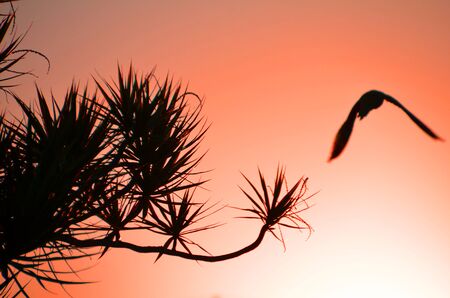A bird is flying in the sky at sunset. The sky is a gradient of orange and pink, and the bird is a silhouette. The bird is flying towards the viewer, and its wings are spread wide. The image is peaceful and serene, and it evokes a feeling of hope and freedom.