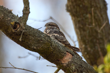 Nightjar(Caprimulgus europaeus) sitting on a tree in the afternoon.