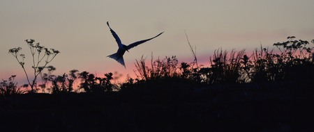 Silhouette of Common Terns on red sunset Sunset Sky. The Common Tern (Sterna hirundo). in flight on the sunset grass background. Sunrise Backlight seabird of the tern family Sternidae