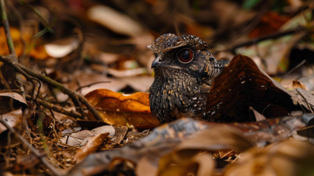 A small bird is sitting on top of a pile of leaves, blending in with its surroundings. The bird appears to be resting and observing its surroundings in a natural setting.