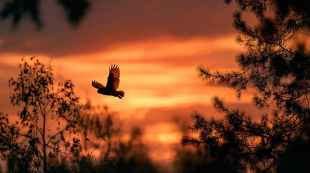 Wild bird flying against a dramatic orange and teal dusk sky, silhouetted forest below, symbolizing freedom and nature