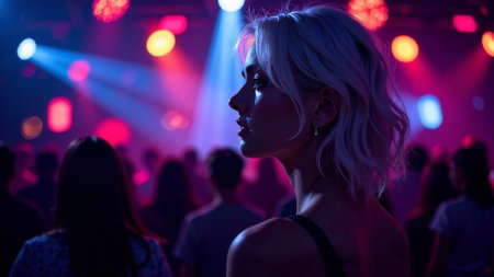 Beautiful Girl with White Hair at a Disco in a Dark Room.