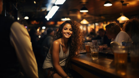 Beautiful young woman sitting in a pub, drinking beer and smiling