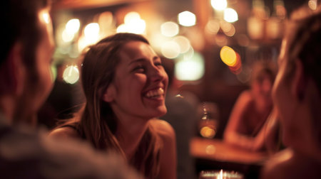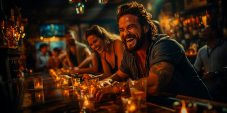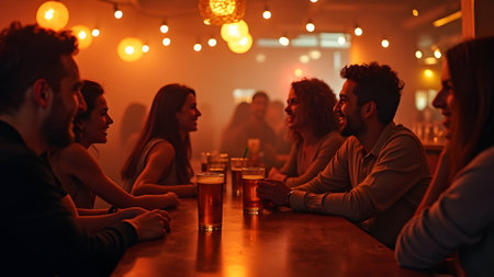 Cheerful young people enjoying drinks and lively conversation at a stylish bar counter, creating a vibrant atmosphere of friendship and fun
