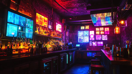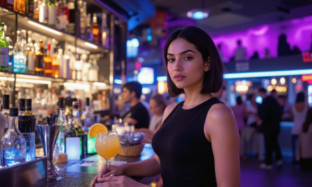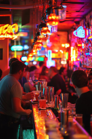 Bar customers and bartenders enjoying a busy night, drinking cocktails and socializing under neon lights
