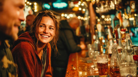 Woman smiling warmly at a bar counter, surrounded by drinks and glowing lights in a cozy evening atmosphere.