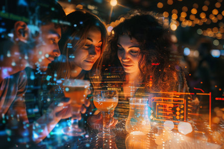 Group of friends at beer festival, surrounded by holographic beer menus, fantasy style, vivid colors, immersive environment