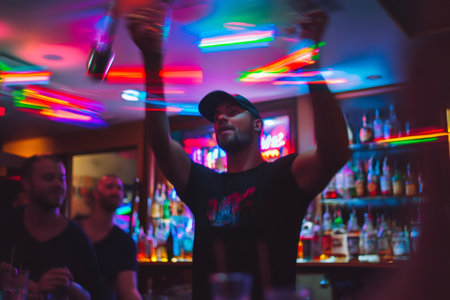 Bartender juggling bottles and glasses in a nightclub with neon lights and motion blur effect, entertaining customers at the bar counter