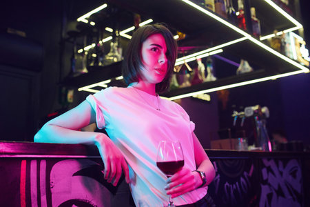 Beautiful woman with brown hair is standing in the night club and holding drink.