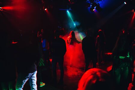 Portrait of a beautiful young woman dancing in a nightclub with lights