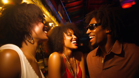 Happy young glamorous woman of African ethnicity among her dancing friends