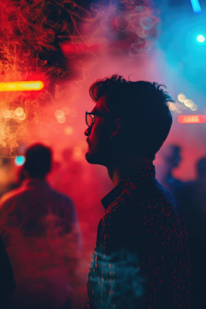Amidst a vibrant party alive with rhythmic music and energetic dancing, a lone figure stands at the edge, visibly uncomfortable and disconnected from the celebration. The colorful lights create a lively atmosphere, yet this individual appears trapped in a bubble of solitude, highlighting the contrast between joy and social anxiety. This moment captures the essence of feeling isolated in a crowd, where laughter and movement surround but do not include them.