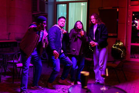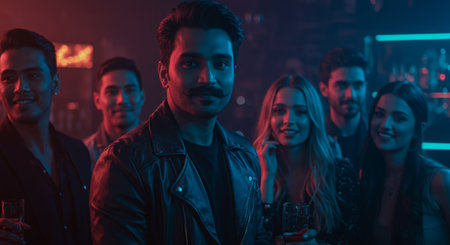 Friends celebrate together in lively indoor setting with colorful lighting at night