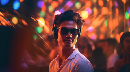 A dedicated security officer monitors the lively nightclub, ensuring safety amidst an energetic crowd, colorful lights, and a vibrant, joyful atmosphere.