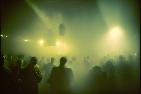 Nightclub with misty smoke environment, dreamy silhouette crowd dancing along with the music, rave party with techno theme with DJ live performance in music festival. Superb Generative AI.