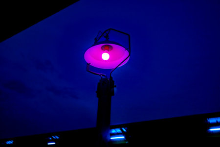 Neon pink railway lamp glowing under deep blue night sky with background blue light. Modern urban night glow in cyberpunk style, transport scene.