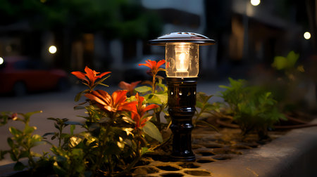 A charming vintage street lamp casts a warm glow in a bustling city, creating an enchanting scene with blurred bokeh lights that evoke a sense of tranquility and beauty.