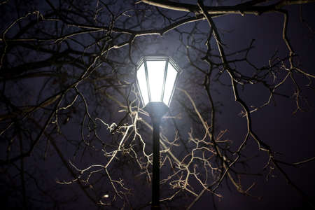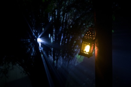 Beautiful colorful illuminated lamp in the garden in misty night. Retro style lantern at night outdoor. Selective focus
