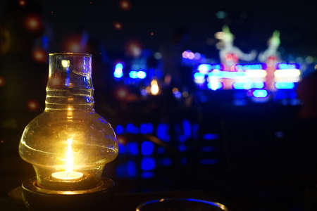 Retro style lantern at night. Beautiful colorful illuminated lamp at the balcony in the garden. Selective focus