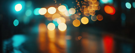Vibrant city street glistens under rain, with colorful bokeh lights creating a dreamy atmosphere. Shimmering reflections add to the urban landscape\'s charm at night.