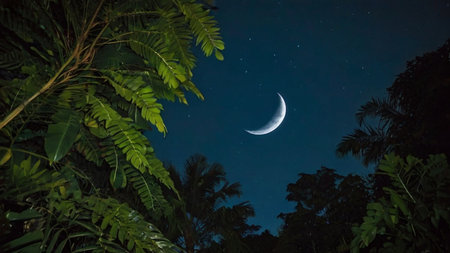 Deep blue nighttime landscape showing a bright waxing crescent moon and countless pinprick stars contrasting sharply with the dark silhouette of trees and the distant yellow glow of urban lights.