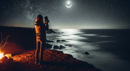 Photographer taking photo of beautiful night landscape. Mixed media. Mixed media