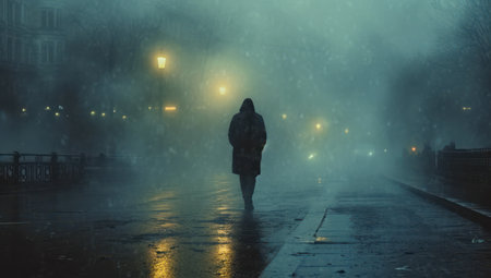 Loneliness Concept. Retired Man Walking in the Fog Street extreme closeup. Generative AI