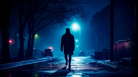 Man walking down street at night in the rain with umbrella. Generative AI.
