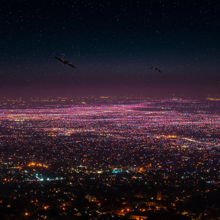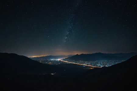 Starry night reveals vibrant city lights against a contrasting dark sky
