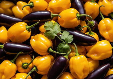 A vibrant, high resolution close up features an abundant heap of fresh, bright yellow habanero peppers and dark purple jalapenos, intermingled to create a striking visual. ideal for food, cooking, or healthy eating themes.
